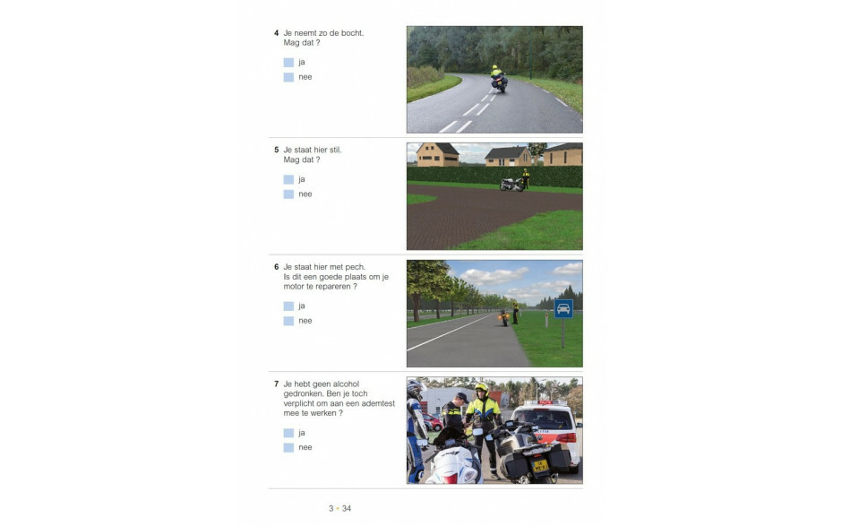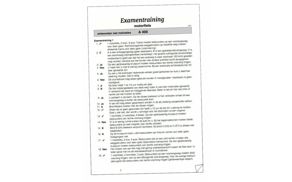 Examentrainingsboek met 400 vragen voor de motor verdeeld over 7 examentrainingen en 1 bordentraining. Elke training bevat in totaal 50 vragen.